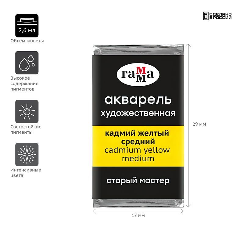 Читать все статьиАкварель художественная Гамма «Старый Мастер» кадмий желтый средний, 2,6мл, кювета
