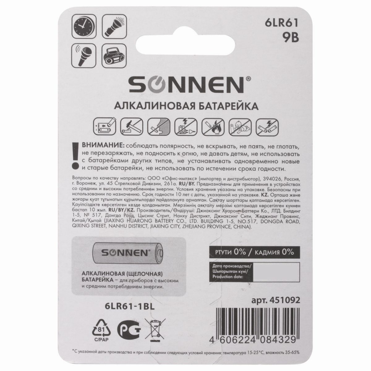 Батарейка SONNEN Alkaline, Крона (6LR61, 6LF22, 1604A), алкалиновая, 1 шт., блистер, 451092