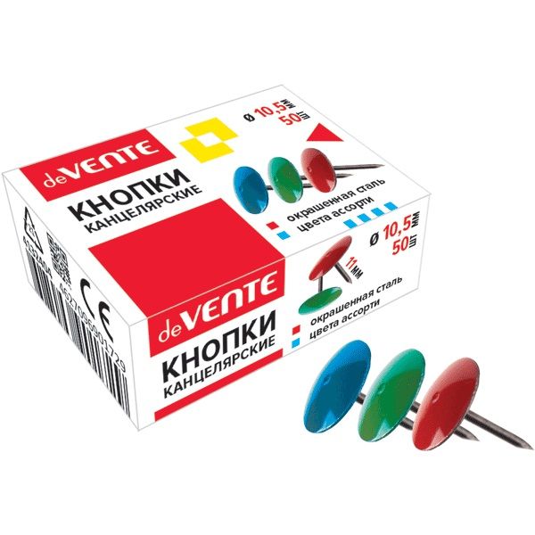 Читать все статьиКнопки канцелярские-гвоздики deVente, 10,5 мм, 50шт, цветные, к/у