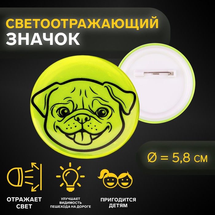 Светоотражающий значок «Мордочка мопса», d = 5,8 см, цвет МИКС