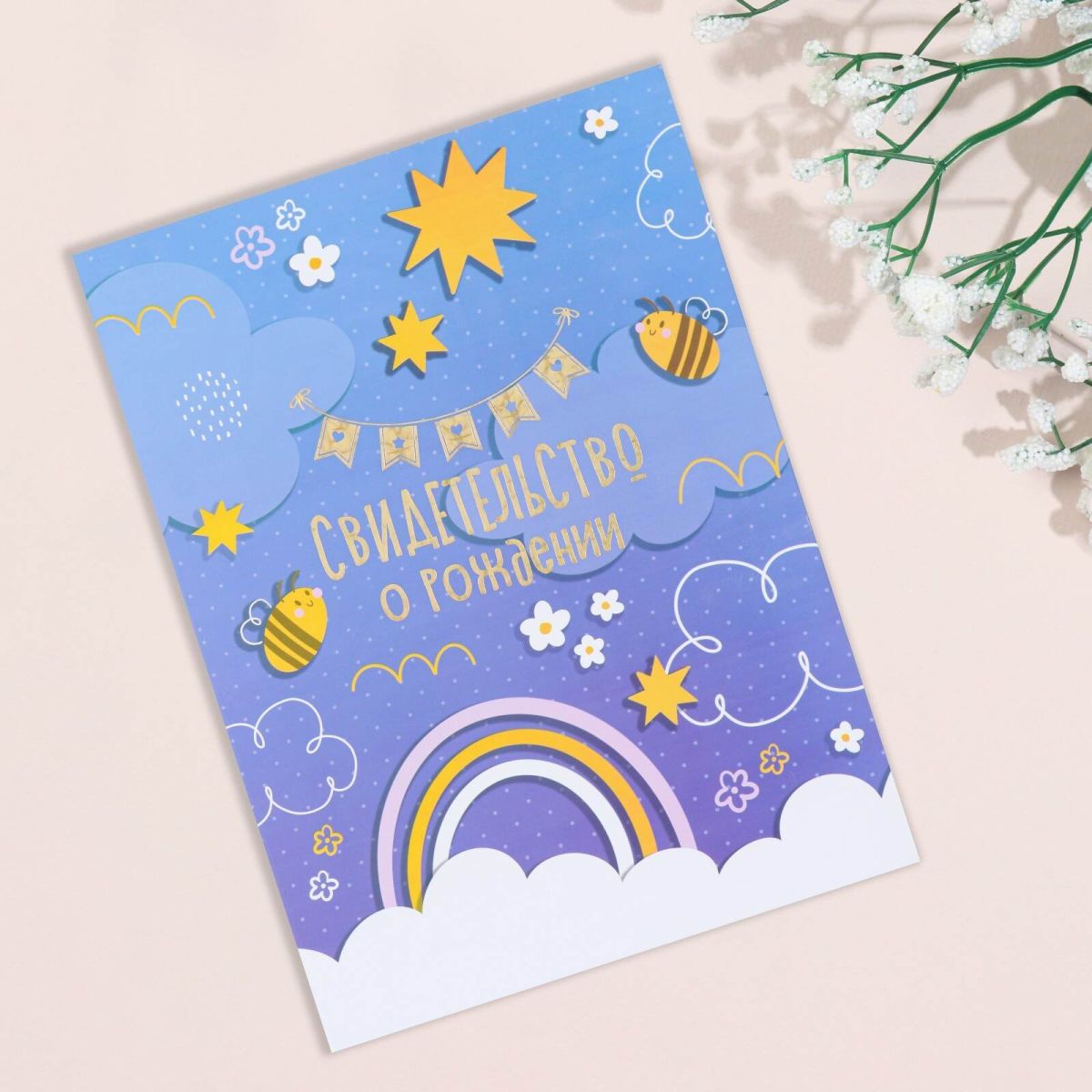 Читать все статьиСвидетельство о рождении «Радуга и облака» тиснение, фиолетовый фон, А4